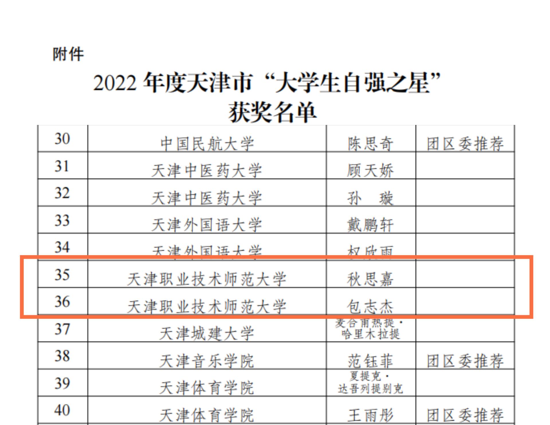 球友会两名学生获评2022年度天津市“大学生自强之星”